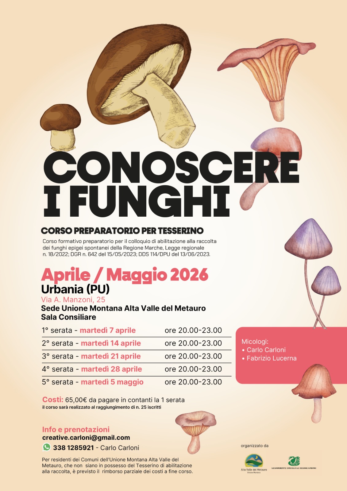 Si comunica che l’Unione Montana Alta Valle del Metauro, in collaborazione con l’associazione Legambiente – Circolo Le Cesane Urbino, organizza il corso formativo “Conoscere i funghi”, finalizzato alla preparazione dei partecipanti al colloquio di abilitazione per il conseguimento del tesserino per la raccolta dei funghi epigei spontanei, ai sensi della normativa regionale vigente.